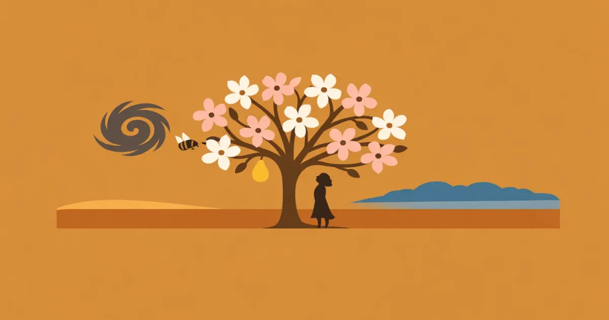 Structurally, the book is a frame narrative. The present-tense Eatonville porch opens Chapter 1 and closes Chapter 20, and everything between is Janie's oral storytelling to Pheoby, rendered in a free indirect style that lets Hurston shuttle between standard literary English in the narration and rich African American Vernacular English in the dialogue. That split is not decorative — it stages the novel's argument about whose voice gets to shape a life. Hurston, a trained anthropologist who had collected folklore across the rural South and the Caribbean, uses the frame to make Janie the author of her own myth rather than its object. The repeated motifs — the pear tree in bloom, the horizon, Janie's heavy unpinned hair, the hurricane — accumulate into a private vocabulary that gives the book its particular, unmistakable sound.